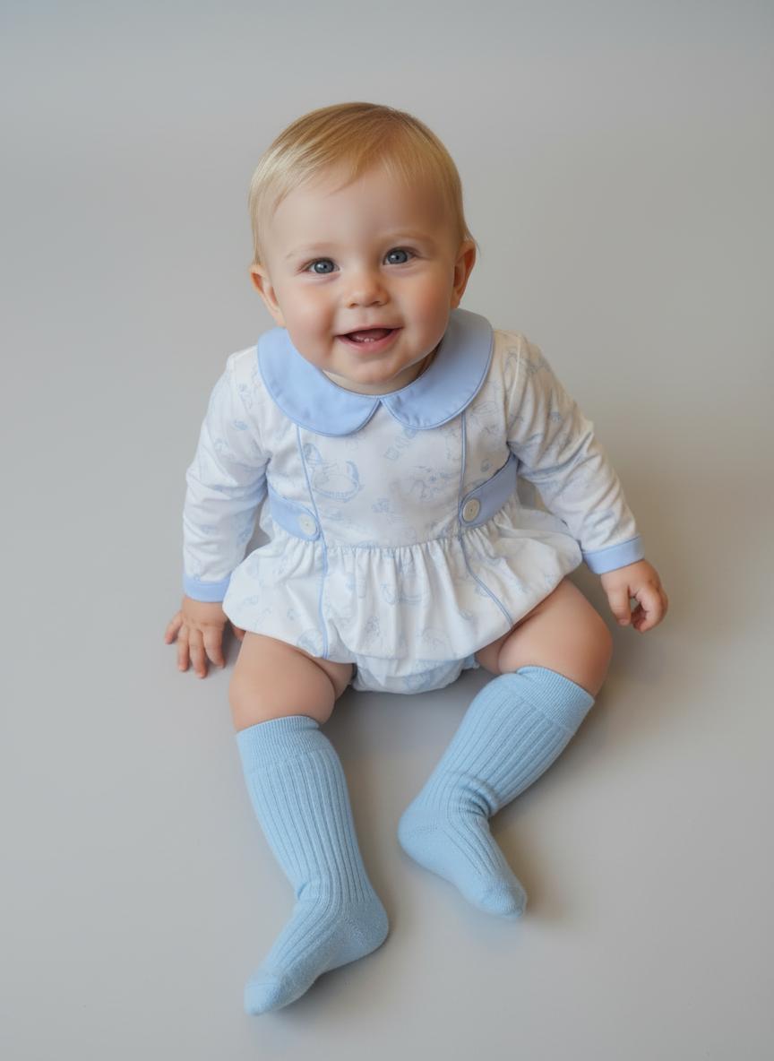 Little Angels Toile Blue Long Sleeve Romper